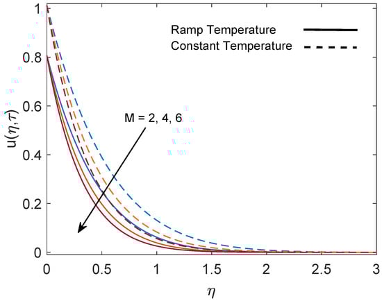 Figure 2 describes the variation in momentum profile with alteration in values of M. It can be seen that the mass boundary layer thickness reduces when the value of M increases. This is physically justified by the existence of the Lorentz force which arises due to the imposed magnetic field. This Lorentz force together with allied forces act as a dragging force which leads to a reduction of fluid velocity. This Lorentz force gets weaker far away from the plate, and the fluid eventually comes to rest. Furthermore, the velocity profile is higher in the case of isothermal temperature conditions in comparison with ramped temperature conditions.