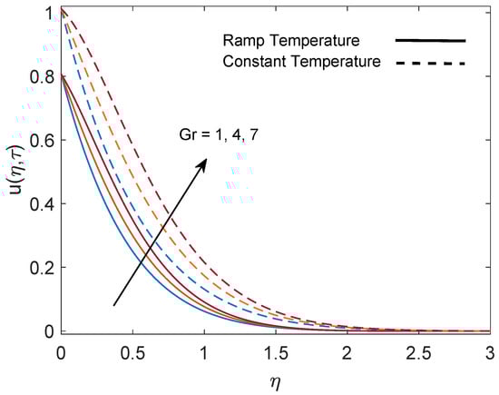 The impact of Gr on the mass profile for ramped and isothermal plates is sketched in Figure 3. It can be seen that the mass boundary layer thickness increased with increasing Gr values. This is because Gr is the fraction of buoyancy and viscous forces. An increase in Gr values means a reduction of viscosity and increased strength of buoyancy force. This strong buoyancy force near the plate acts as a driving force, which ultimately increases the height of velocity curve. Eventually, away from the plate, this force along other aiding forces loses its strength and the fluid gradually calms down. Moreover, the velocity is lower for the ramped condition in contrast to the isothermal condition.
