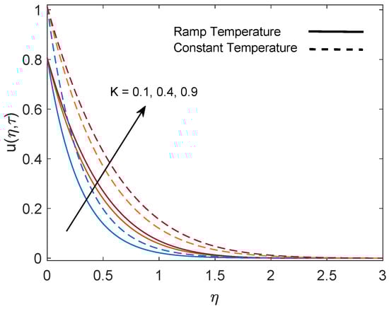 Figure 4 illustrates the velocity distribution for increasing values of K. An increase in K enhances fluid velocity in both isothermal and ramped conditions and the mass boundary layer thickness is higher in the case of isothermal temperature condition. The factor providing enough ground for such enhancement is that when the material’s porosity is intensified, the viscous force decreases and consequently the fluid accelerates.