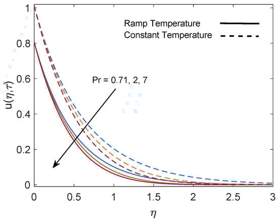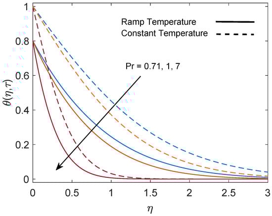 In Figure 5, the influence of Pr on the momentum profile for isothermal and ramped temperature conditions is observed. The fluid velocity reduces as Pr increases. As Pr is the weightage of momentum diffusivity and thermal diffusivity, an increase in Pr corresponds to enhanced viscosity, which makes the fluid thicker. Consequently, the fluid moves slowly and finally comes to rest away from the plate. The momentum boundary layer thickness has large values in the case of isothermal temperature in contrast to ramped wall temperature conditions.