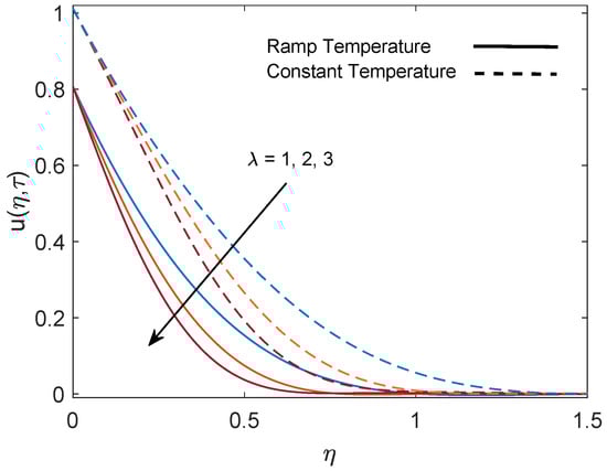 The key role of relaxation time in the flow of fluid for ramped wall and isothermal wall conditions is presented in Figure 6. An increase in the Maxwell parameter leads to a decrease in velocity. In the physical sense, relaxation describes the return of a perturbed system to a state of equilibrium. As an increased relaxation time implies that the fluid will take extra time to become calm, this readily justifies the decrease in velocity. A comparative analysis presented later in this paper found that fluid velocity had a higher profile in the case of isothermal temperature condition.