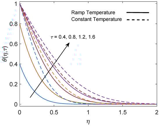 The influence of Pr on temperature profiles is given in Figure 7. The energy profile decays with increasing Pr values because of small thermal conductivity. For small Pr values, the fluid receives a large amount of heat and so the thickness of the temperature boundary layer eventually increases. In the case of an isothermal plate, the temperature solution has higher profile. Figure 8 reveals that increase in dimensionless time elevates the temperature profiles for both ramped and isothermal wall conditions.