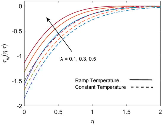 The significant relationship between the Maxwell parameter and shear stress is demonstrated in Figure 9. An increase in results in decreasing shear stress magnitude. This is justified by the significant decay in internal viscosity due to small friction. Additionally, it is interesting to note that shear stress has greater values in the case of ramped wall temperature in contrast to isothermal temperature.