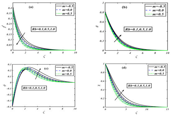 This section is set to explain the emerging consequences of the involved parameters on the physical quantities of interest. Similar to the traditional way, the involved parameters have been assigned some fixed values such as , and , and . Furthermore, the complete analysis has been performed in view of the shear thinning case second-grade fluid , and shear thickening case The variation in the impact of the buoyancy ratio parameter over velocity distribution is drawn in Figure 1a. It illustrates that the velocity component decreases on the rising variation of the buoyancy ratio parameter with the power law index . The physically buoyancy ratio parameter is the phenomenon of upthrust of fluid to objects, which exerts pressure on it. The discussion of the buoyancy ratio parameter rose to another next level when it was considered for the temperature profile. The behavior of temperature distribution in relation to the variation of the buoyancy ratio parameter can be traced from Figure 1b. It can be noticed that the curve of temperature profile rises when the buoyancy ratio parameter is increased. Regarding the concentration profile, the buoyancy ratio parameter has a unique trend, as graphed by Figure 1c. It can be viewed that the concentration profile gets an uplifting effect with the buoyancy ratio parameter. When the buoyancy ratio parameter is varied by higher values, the concentration distribution shows a rising inclination in the graph, which depicts that the fluid is concentrating more and more in the boundary layer region. The motility profile is the characteristic of moving microorganisms mixed in the fluid. Figure 1d is the description of this whole effect. It can be noticed that when the buoyancy ratio parameter is enhanced, then the motility of the microorganism also increases; i.e., the motile particles become more active. The bioconvection Rayleigh number is a dimensionless parameter that is used to measure the fluid instability due to the density differences as described in study [39]. The effect of on velocity distribution is considered to be very interesting, as it is the effect of instability that is caused by the dense layer of microorganisms at the top of the fluid. This top dense layer breaks, and ultimately, the microorganisms fell down. Then, they move up to attain their motive (gravitative, phototactic, chemotactic, etc.). Figure 2a is the exhibition of the result between the Rayleigh number and velocity distribution. It displays that when the bioconvection Rayleigh number is uplifted, it causes a reduction in the velocity distribution. The investigation of on the temperature profile for the power law index is illustrated by Figure 2b. The conduct of on thermal distribution disclosed that the temperature profile rises when we give a higher value to the Rayleigh number. The concentration profile is one of the main characteristics of the Rayleigh number, as it causes the instability of the fluid. Figure 2c depicts that tends to grow the concentration of nanoparticles in fluids. Actually, this is one of the main interests of our work to control the sedimentation of added/mixed nanoparticles. Figure 2d illustrates the behavior of a motile microorganism versus the bioconvection Rayleigh number. It can be noticed that the density function of the motile microorganism is increased with higher Rayleigh number values. Generally, the motile microorganism characteristics of the mobile particles in a fluid are used for an increased heat transfer phenomenon. The behavior of stretching parameter has been examined in Figure 3a. Regarding increments in the stretching parameter , the velocity of the fluid particles diminishes. Here, the power law index is applied on discussed respectively. We can say that physically, the stretching parameter provides more strength to velocity distribution . The impact of the stretching parameter on the concentration function with the same fixed values of the power law index parameter is plotted in Figure 3b. The plot depicts that when is taken to be , the concentration profile increases as we raise the stretching parameter , but a contrasting effect is observed when we take , so that the volumetric nanoparticle concentration distribution shows a retarding effect for increasing the value of stretching parameter . The phenomenon of the motile microorganism of the fluid for the flow of a modified second-grade nanofluid is measured on assorted values of stretching parameter for three individual values of the power law index . The complete sketch is figured out in Figure 3c. When the power law index is taken to be , then the motility of the liquid intensifies for rising values of stretching parameter , but when , the trend for the concentration of motile microorganisms goes down as we uplift the stretching parameter . Hence, we conclude that the profile of increases for shear thickening and decreases for modified second-grade and shear thinning fluids, as described in Figure 3d. The effect of the first-order velocity slip parameter with the power law index on velocity is sketched via Figure 4a. The first-order velocity slip parameter is also a medium characteristic affecting the fluid of the velocity distribution. The sketched graph shows that for all the three chosen cases of power law index , when we uplift the first-order velocity slip, it causes a reduction in the velocity distribution. Figure 4b illustrates the behavior of the second-order velocity slip parameter on velocity distribution for an addition with power law index . Actually, this slip parameter is a medium characteristic that affects fluid flow. The velocity distribution retards when we vary with higher values. Generally, gives a slope of second order for the fluid flow with different characteristics, which reduces the velocity distribution. Hence, enhancement in the value of causes decay in the velocity contour. The mixed convection parameter is the phenomenon of the combined interaction of 