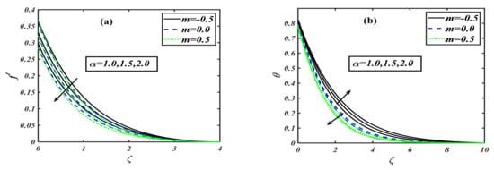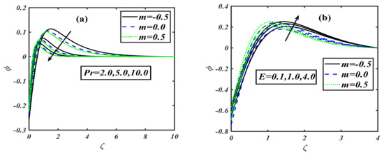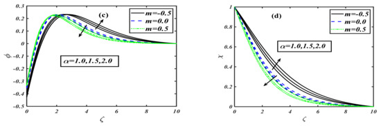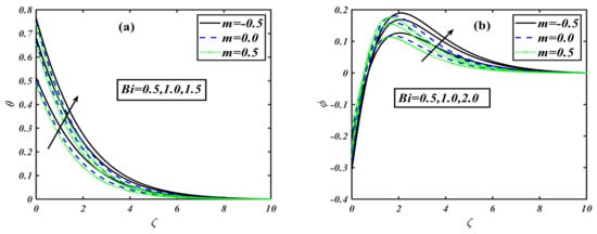 The system of the non-linear coupled ordinary differential Equations (15)–(18) with the boundary conditions (19) and (20) has been computed by bvp4c [37,38] in MATLAB with a tolerance level of . In the bvp4c routine, a three-stage Lobatto-IIIA method is employed in the development of this collocation technique. The bvp4c function of computational software MATLAB only resolves the first-order ordinary differential equations. To approximate the solution of the distorted non-linear ODEs (ordinary differential equations), appropriate initial guesses satisfying the pertinent boundary conditions are required. For further approximation, the initial guess is modified with the help of shooting technique. Let us consider