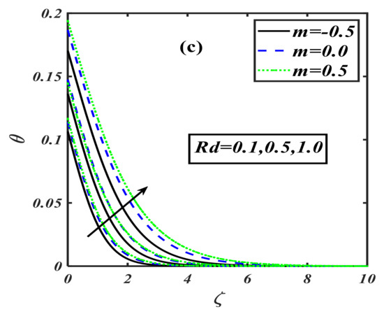 where notifies the Knudsen number, and stand for constant numbers, and expresses the free path associated with the molecular mean motion. In the above equations, is the material-related parameter, represents the power law index, represents the motile microorganism particles density, represents the nanoparticles density, represents the average volume of the microorganism, represents the gravity, notifies the temperature of the nanofluid, reflects the nanoparticles’ volume resistance, stands for the friction coefficient, represents the heat capability of fluids, represents the impressive heat capacity of the nanomaterial, symbolizes the Brownian diffusivity, represents the Stefan Boltzmann constant, represents the mean absorption coefficient, stands for the thermophoresis diffusion coefficient, reflects the activation energy coefficient, reflects the reaction rate constant, represents the chemotaxis constant, describes the superlative cell swimming rapidity, and is the microorganism’s diffusion coefficient. Equations (5)–(9) are non-dimensionalized by the following variables [22]: