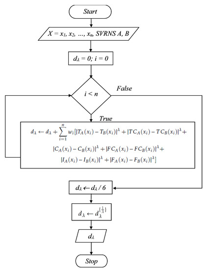 The algorithm to obtain the generalized SVRNS weighted distance between two SVRNS A and B is given in Algorithm 1.
