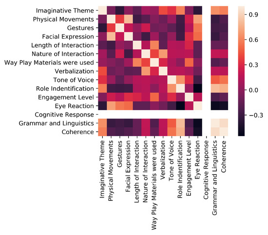 Heat map, which strongly demonstrates the factors of correlation and associativity, has a colour scale in which lighter shades signify positive correlation and darker shades signify a negative correlation. Correlation between any two parameters signifies their associated relation. Positive correlation happens when an increase in one attribute shows an increase in another attribute as well. Negative correlation happens when an increase in one attribute shows a decrease in another attribute. The heat map, which strongly demonstrates the factors of correlation and associativity, has a colour scale in which lighter shades signify positive correlation and darker shades signify a negative correlation. For example, in Figure 3, which is a heat map for feature T, Grammar and Coherence show extremely positive correlation whereas Eye Reaction and Role Identification show a negative correlation.