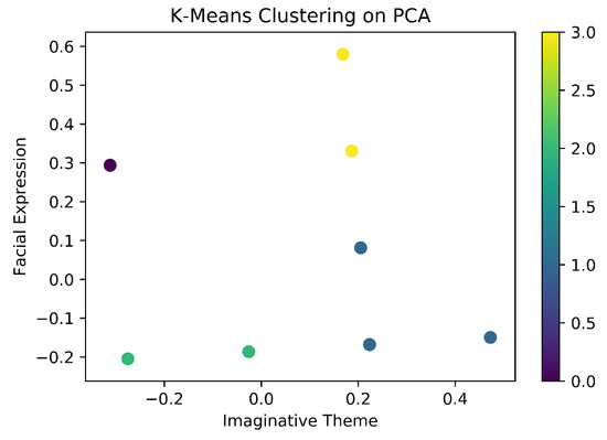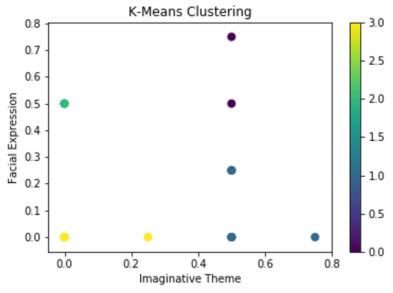 In Figure 5, while testing K-means on feature T for the parameters ‘Facial Expression’ on the y-axis against ‘Imaginative Theme’ on the x-axis, it was found that higher concentration of points lies near x = 0.5 and y = 0.2.