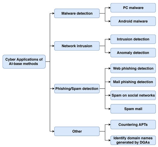 Recently, scientists proposed numerous techniques that have utilized AI methods to detect or categorize malware, detect network intrusions, phishing, and spam attacks; counter Advanced persistent threat (APT); and identify domain generated by doamain generation algorithms (DGAs). In this section, we category these literature into four main groups: malware identification; network intrusion detection; phishing and SPAM identification; and other, which compromises countering APT and identifying DGAs. Figure 1 illustrates the primary areas of utilizing AI for cybersecurity.