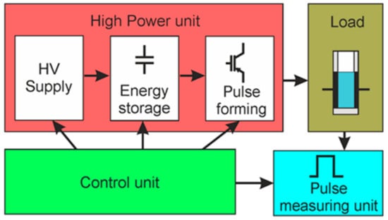 The concept of the generation of square-wave electrical pulses is based on the connection of the load to the charged capacitor for the limited time representing the pulse width. The basic parameters of such square-wave pulses are the following: the pulse amplitude, the voltage drop during the pulse, the pulse duration, and the rise and fall times of the pulse. A simplified block diagram of the proposed square-wave pulse generator is presented in Figure 1. It consists of the high-power, control, load, and pulse-measuring units. The high-power unit includes the high-voltage (HV) supply, energy storage, and pulse-forming units.