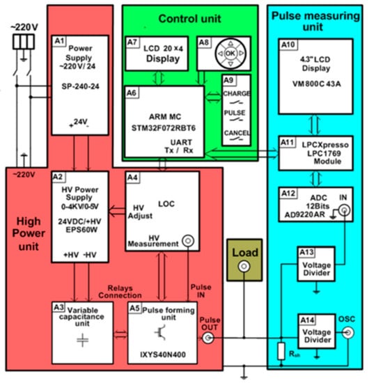 When the main parameters are set, the capacitors can be charged by pushing the “Charge” button from group A9. Starting at this moment, the system is set to the pulse generation stage. Microcontroller A6, through the optical driver A4, gives the command to the HV power supply A2, which starts to charge the capacitors’ connection inside block A3. During this process, the voltage of the capacitors is monitored in real time in the LCD display A7. This stage is also highlighted by the blinking of the red photodiode until the capacitors are charged up to the set voltage. After the capacitors are charged, the pushing of the button “Pulse” starts the discharge of the capacitors through the load. During this time, the microcontroller sends a command to the driver of transistor VT1 and opens it. Before the end of the pulse (the “turn off” of transistor VT1), the microcontroller sends a command to transistor VT2 and turns it on to create a second path for the high current flow through the crowbar circuit. As a result, the fall time of the pulse is shortened and is dependent only on the type of switches that are used and the parasitic parameters of the circuit. Without the synchronized crowbar circuit, the characteristic tail that depends on the load would appear.
