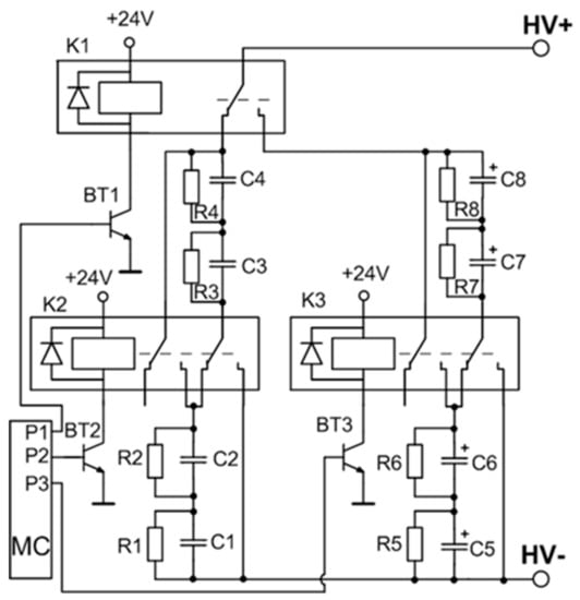 A detailed circuit of the variable capacitance unit is shown in Figure 3. The switching of the capacitors is implemented by using three high voltage relays. A low-power transistor (BT1–BT3) driven by a respective microcontroller port pin results in a three-transistor/relay structure and controls each relay. The opening of these transistors allows for the coverage of all the capacitor commutation variations required for the setup. Four possible connections are realized: range 1—two by two capacitors CLV connected in series (C5 and C6, and C7 and C8), and then interconnected in parallel; range 2—four capacitors CLV (C5–C8) are connected in series; range 3—two by two capacitors CHV (C1 and C2, and C3 and C4) are connected in series and then interconnected in parallel; and range 4—four capacitors CHV (C1–C4) are connected in series. The total capacitance and the maximal operating voltage of the energy storage unit for the different connection configurations (ranges) is presented in Table 1.