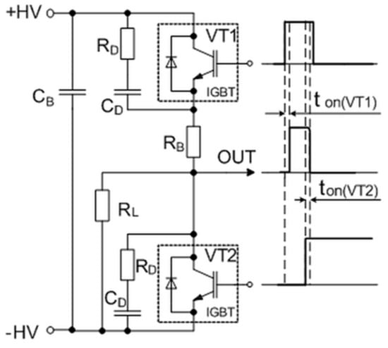 The simplified circuit of the pulse-forming unit with corresponding control and output waveforms. Here, ton(VT1) and ton(VT2) are the delay times between the control pulses of transistors VT1 and VT2 and the rising and falling edges of the output pulses, respectively. IGBT: Insulated-gate bipolar transistor.