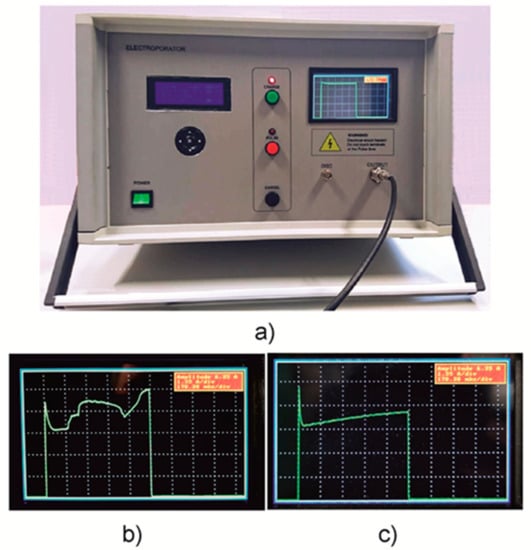 The pulse generation is performed via three buttons in the middle of the device. In addition, this stage of operation is also highlighted by the red photodiode. The LCD is placed on the right side and provides pulse visualization and information. Furthermore, a high-voltage output connector for the load (cuvette with treated substance) and a BNC connector for an external oscilloscope are shown. The current pulse visualization on the display of the device allows for better control of the electroporation process. As an example, two images of the device screen are shown in Figure 5b,c. The first (b) shows the case when some sparking takes place in the cuvette during the experiment. Therefore, one can see the current jumping on the screen. The second picture (c) shows the gradual increase of the current caused by the heating of the contents of the cuvette or the chemical processes in the liquid.