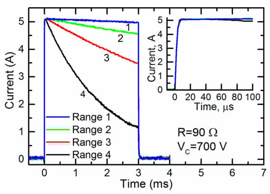 One can see that the current through the cuvette was almost constant throughout the whole pulse only in range 1 (see Table 1). For the other ranges 2–4, the current noticeably decreased. Thus, for the generation of a pulse of a given duration for loads with this and lower resistances, range 1 was the most acceptable. At the same time, the inset in Figure 6 shows that the initial part of the same current pulse during the first 100 ms was almost constant at all operating ranges. Thus, all of them could be used for the generation of short pulses. It should be noted that electroporation using short pulses is usually accompanied by a high voltage. Therefore, the fourth range of operation of the generator, in which the maximum charge voltage of the capacitors reached 4 kV, was the most acceptable.