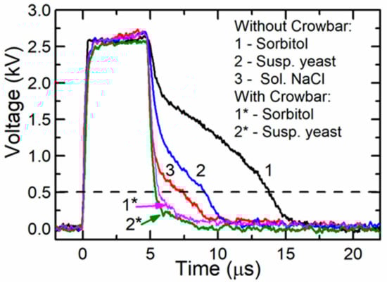 In the experiments, the yeast cell suspension was transferred into the same cuvette and exposed to a single 5-µs pulse with an amplitude up to 2600 V (electric field strength was 26 kV/cm). The resistance of the cuvette filled with the yeast suspension was R ≈ 220 Ω. Experiments were performed with without the crowbar circuit. The pulse shapes for both cases were discussed above and presented in Figure 7 (2 and 2* curves, respectively).