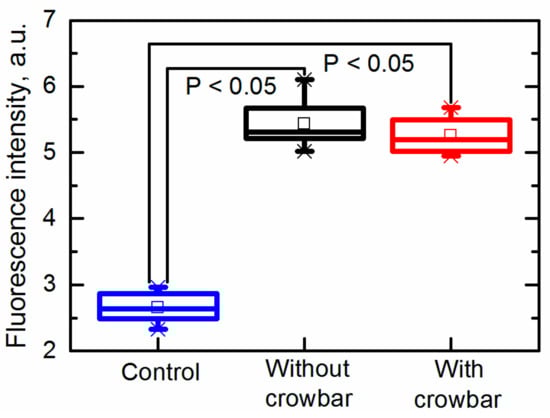 It was found that both pulses (the electric field strength was 26 kV/cm) generated with and without the crowbar circuit induced electroporation. It was found that the fluorescence intensity (FI) increased from FI = 2.7 ± 0.2 a.u. (untreated sample) up to FI = 5.4 ± 0.4 a.u. and FI = 5.3 ± 0.3 a.u. in samples exposed to pulses generated without and with the crowbar circuit, respectively. Thus, the differences between the induced membrane permeability in both cases was insignificant. It should be noted that the fluorescence was measured when the dye was added into the suspension just 10 s after its exposure to PEF; therefore, no influence of the pulse shape (decay time) on the cell damage or other processes was noticed during such short period.