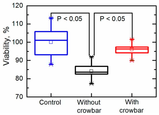 Our previous study showed that the detectable electroporation in yeast cells starts after exposure to 5-µs pulses with an electric field strength of approximately 5 kV/cm []. Such an electric field corresponds to a 500-V amplitude (dashed line in Figure 7) and such an electric field strength or higher remained for 8.4 µs and 5.5 µs when generated by systems without and with the crowbar circuit, respectively. The difference in the pulse duration (at the level of the threshold electric field strength) was 3.1 µs, while the energy delivered by such pulses differed by 14%. It was previously shown that the pulse parameters (pulse shape, duration, frequency) could have an effect on the cellular response []. In our experiments, the duration of the maximal amplitudes was similar and resulted in similar electroporation. From the viability experiment, however, we can conclude that the total energy input, as well as the pulse shape, could contribute to the reduction of the cell viability and should be accurately reported according to the guidelines []. Such a difference in the viability obtained in our experiments was most probably caused by the longer time of exposure during which the voltage exceeded the electroporation threshold.