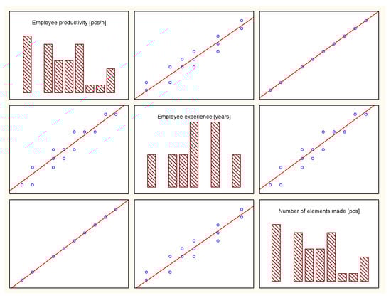 Correlations between variables were examined. The results indicate a relationship between variables (Table 3). Correlations mean that the independent variable has an impact on the independent variable. In practice, this means that employee performance largely depends on the number of components made, employee experience, and the time of grinding. The most correlated independent variables are “number of items made” and “employee experience”. Some methods, such as multiple reflection, require variables not to be strongly correlated. Therefore, one of these variables will need to be excluded from the analysis, because it can generate a larger error or completely prevent calculations.