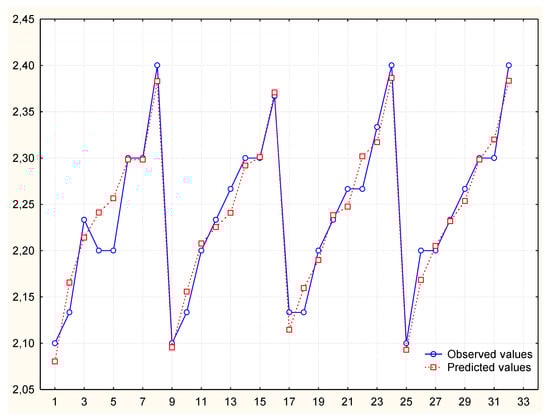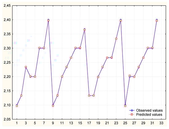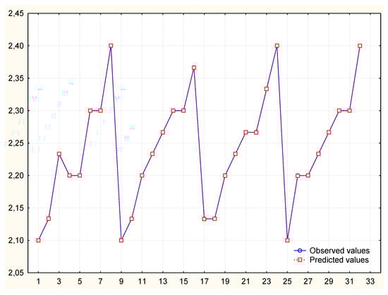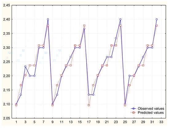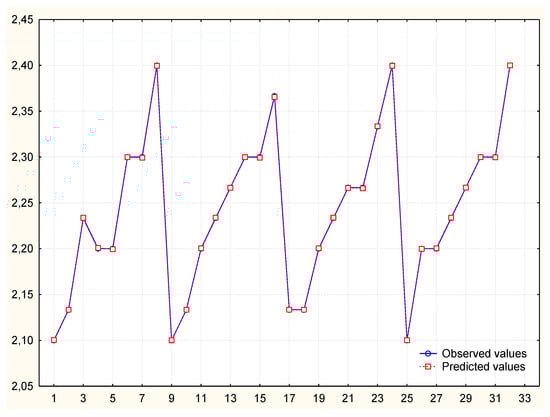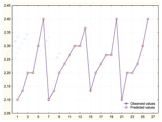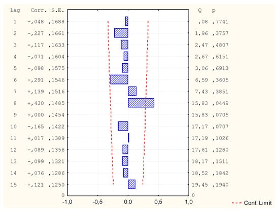 To obtain a better prediction, the independent variable “number of elements made” was modified so that its distribution was normal. The variable v3 was logarithmized and then used in the analysis (Table 5). Despite the good mapping on the graph of predicted and observed values, it turned out that in comparison the values of autocorrelation of residues and autocorrelation of partial residues exceed the limit. Thus, the model is not correct (Figure 5, Figure 6 and Figure 7) and its analysis and calculation of the MAPE error was not continued.