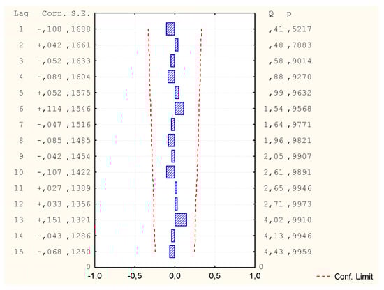 The regression line expresses the best prediction of the dependent variable for given independent variables. However, nature is rarely perfectly predictable and we usually deal with deviations of the measurement points from the regression line. The deviation of a given point on the graph from the regression line (i.e., its predicted value) is called the “residual” value. During the individual analyses, their correctness was checked and assessed by means of the autocorrelation check and partial autocorrelation of residues, as well as fit charts. All analyses, in the last phase of work, were subjected to the MAPE error test. The MAPE (Mean Absolute Percentage Error) error [,] is the average absolute percentage error that is made when forecasting based on a specific model. This parameter is known by analyzing the accuracy of forecasts constituting the basis for building the estimation model. It informs about the average size of measured errors. It follows that the smaller the MAPE, the better. The error is expressed by the formula:
