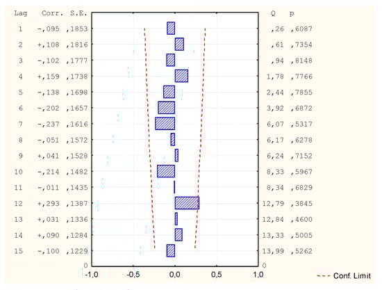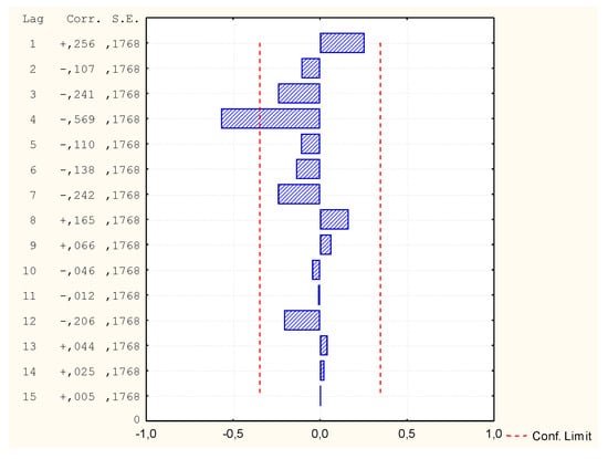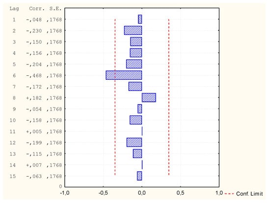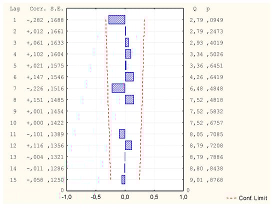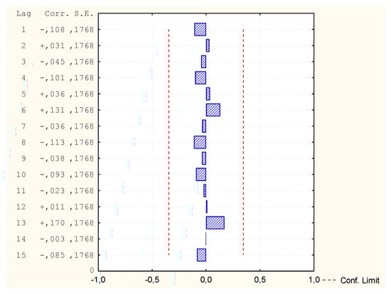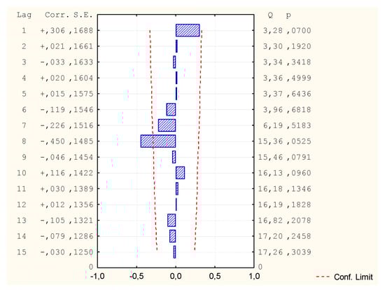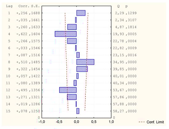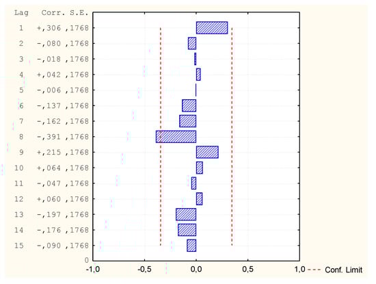 Due to the fact that not all variables had a normal distribution, it was decided to carry out another GAM analysis, this time assuming the distribution of the Gamma variable and Log binding function. All independent variables were assumed for calculations of the v1 variable. However, the program rejected some independent variables due to too few different data values in these cases (Table 10). Despite the very good mapping on the graph of predicted and observed values, it turned out that in comparison the values of autocorrelation of residues and autocorrelation of partial residues exceed the limit (Figure 14, Figure 15 and Figure 16). Thus, the model is not correct and its analysis and calculation of the MAPE error was not continued.