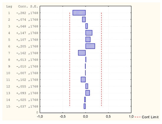 The correctness of calculations was determined based on the function of residue correlation and partial autocorrelation of residues. The residual series, which arises as the difference between the measured values and the predicted values, should have an average close to zero. At the same time, its standard deviation need not be zero. If the model is correct, no random correlation should occur. However, computational practice shows that if the limit values are not exceeded in the first 8 delays, the model can be assumed to be correct.