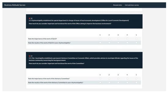 In the first analysis, the research is exclusively focused on the criteria in which improvement is in the jurisdiction of the local government—LBFC. The criteria that are within the competence of national institutions (such as tax incentives or subsidies) are not included in the study. By completing the questionnaire, the opinion of the business community is included in the analysis of this important issue. The identity of the participants is anonymous and only visible to researchers. The main goal of the actual research conducted by the Society of Economists of Niš is to recognize the economic policy at the local level, which would allow the local authorities to contribute, regardless of the state institutions, to the enhancement of the business climate and thus contribute to a rise in economic activity. An example of the online questionnaire (anketa.investnis.rs) for collecting the data from clients is given in Figure 4.