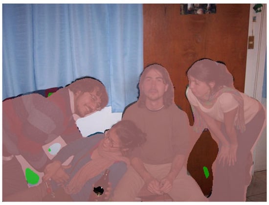 (2) In an image, a foreground object is often composed of a series of regions. Inside these regions, its color, lightness and texture have little changes. DCNNs based semantic segmentation methods directly classify every pixel in the image and have no idea that these regions belong to the same object. Figure 2 is a semantic segmentation result output by DeepLab v3+. From it, we can see that the areas labeled with green color are segmented separately from the regions they should belong to, which is incorrectly segmented. In order to tackle this problem, we employ a region-based method to postprocess semantic segmentation results of DeepLab v3+.