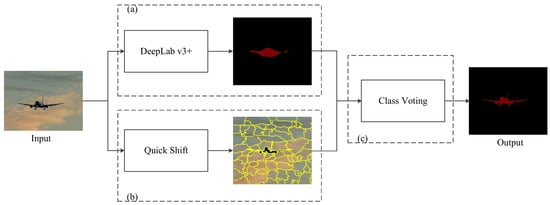 Framework of the proposed method is shown in Figure 3. It consists of the following three modules: (a) DeepLab v3+, (b) superpixel segmentation-quick shift, and (c) Class Voting. In (a), we use DeepLab v3+ to obtain a class-indexed score map for the input image. In this score map, each pixel in the input image is marked with an index corresponding to its predicted class. In (b), we use quick shift algorithm to segment the image into superpixels. It outputs the superpixel index of each pixel in the image. Then, the outputs from (a) and (b) are fed into (c) to obtain the refined semantic segmentation results for the input image.