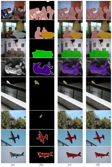 We provide some exemplary results on PASCAL VOC 2012 val set in Figure 6. Note that the details of the target edges in Figure 6d are significantly improved than Figure 6c, and the segmentation results in Figure 6c often include parts of the background. In other words, the proposed method can estimate more accurate objects boundaries than DeepLab v3+, even when the foreground objects are very small. It can also match the ground-truth more consistently and segments foreground boundaries more precisely with images that contain foreground objects in complex environments. The results in Figure 6 implies the effectiveness of the proposed method in localizing objects boundaries when conducing semantic segmentation tasks.