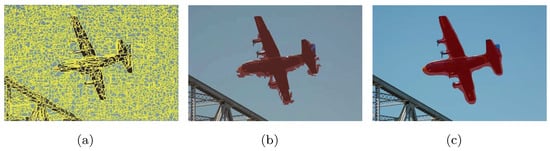 Image segmented using SLIC. (a) shows the raw image, (b) shows applying SLIC on segmentation results from DeepLab v3+, (c) shows outputs from Class Voting module in Figure 3 by using SLIC as the superpixel segmentation algorithm. (In order to better explain the question, we overlap the segmentation result of the target object on the raw image in (b,c).)