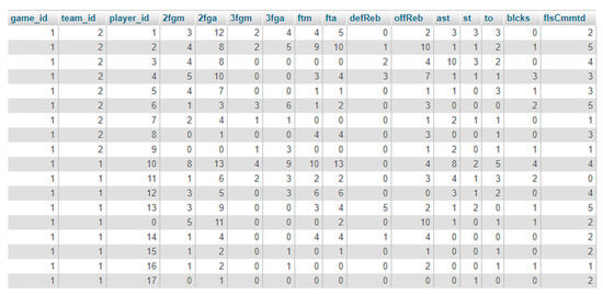 Unstructured data from the Basketball-Reference website are extracted, transformed, and loaded (ETL) into a relational database suitable for further analysis by using a web scraping process. Due to the specificity of data retrieval, a web scraper in the scripting programming language PHP is programmed. The web scraper passes through the website Basketball-Reference, extracts data from a page, transforms them into suitable form, and stores them into a relational database (MySQL). Figure 3 shows the prepared single-game data for all players who participated in the game.