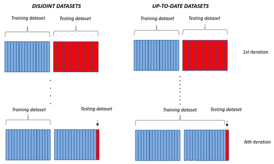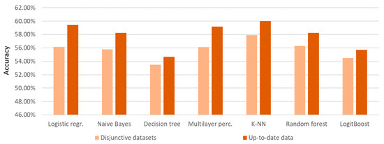 As presented in Figure 9, up-to-date datasets produce better prediction results compared to results obtained by using disjoint datasets. The result is logical given that when using up-to-date data, known test phase data is added to the training dataset. The assumption that the results of using up-to-date data will give better results has been proven.