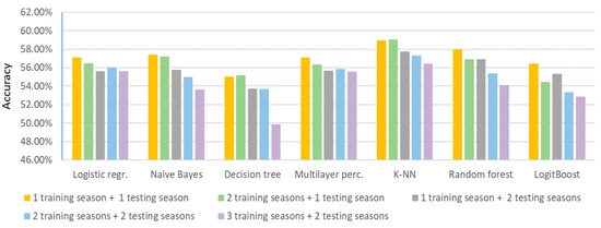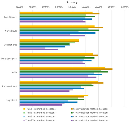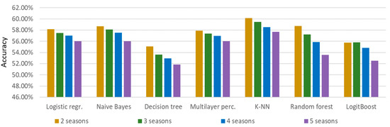 As with the Train&Test validation method, the lowest average prediction results are obtained by using decision trees and the K-NN algorithm gives the best prediction results. The best individual prediction result was also obtained by the K-NN algorithm. It is notable that all of the best individual results, except random forest, were obtained when using two seasons. Also, the results in paper [27] were confirmed when considering the number of seasons used. Figure 6 shows that, as with the Train & Test method, the average prediction accuracy decreases as the number of seasons used increases.