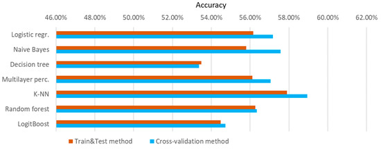 In this chapter, the outcome prediction results by using the Train&Test validation method and the cross-validation method will be compared. Figure 7 provides a comparison of the average algorithm accuracy by using the Train&Test method and the cross-validation method regardless of the used dataset length.