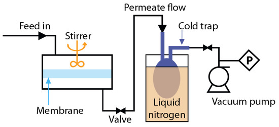 Pervaporation experiments were conducted via lab-scale apparatus with stirring (Figure 2). The effective area of the membrane supported by a metal disk with small gaps was approximately 14.8 cm2. Downstream pressure below 10–2 mm Hg was maintained on the permeate side with vacuum pump MD 1C (Vacuubrand GMBH, Wertheim, Germany). The permeate was collected into a trap immersed in liquid nitrogen, and weighted with the balance Mettler Toledo ME204 (Mettler Toledo, Columbus, Ohio, US). The feed and the permeate concentration was analyzed with a Chromatec–Crystal 5000.2 gas chromatograph (Yoshkar-Ola, Chromatec, Russia) with thermal conductivity detector. The experiments were repeated three times and the average value of the results was considered with an accuracy of ±0.1 wt%.