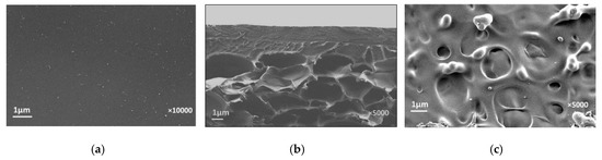 SEM images of asymmetric membrane: (a) top layer, (b) cross-section, and (c) bottom.