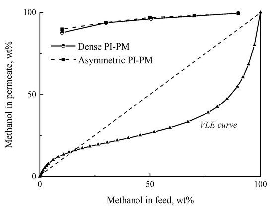 The pervaporation of the methanol/MTBE mixture was studied in a wide range of methanol concentrations at 50 °C using asymmetric and dense membranes. It was found that both membranes are preferably permeable to methanol and exhibit high selectivity in separation of methanol/MTBE mixture, including mixture compositions near the azeotropic point. Figure 6 shows the results of the pervaporation as well as the vapor-liquid equilibrium (VLE) curve of methanol and MTBE mixture at 50 °C and 760 mmHg. It can be seen that pervaporation curves are located higher than VLE curve, and this fact testifies the advantage of pervaporation technique over classical separation method of distillation.