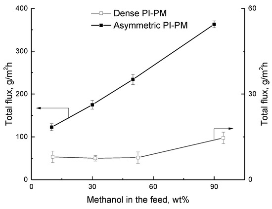 Figure 7 shows the dependence of total flux on the methanol concentration in the feed for asymmetric and dense membranes. It was found that total flux through the membranes increases with increasing alcohol concentration in the feed. An increase in methanol content leads to the enhancement of the penetrant solubility in the membrane due to the greater sorption activity of the membrane with respect to alcohol; as a result, an increase in performance takes place.