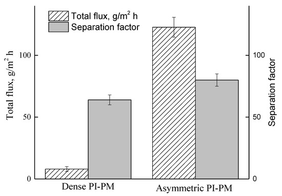 The most important pervaporation application is the separation of methanol/MTBE azeotropic mixture (14.3 wt% methanol and 85.7 wt% MTBE). Figure 8 shows data on the total flux and separation factor in pervaporation of the azeotropic mixture using asymmetric and dense PI-PM membranes with overall thicknesses of 135 and 24 μm, respectively. The main transport parameters are better for asymmetric membrane as compared with dense membrane. The total flux for asymmetric membrane is greater by ~15 orders of magnitude than that for the dense membrane. These results show that the asymmetric membrane is more promising for use in the separation of methanol/MTBE mixture.