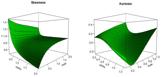 Since the uniform RVs are easily generated numerically in most statistical packages, the above scheme in (12) is very useful to generate MOBE-2 RVs and therefore can be easily implemented. It facilitates ready quantile-based statistical modeling. In particular, the median of is , given by setting in (12). Also using (12), we can determine the Bowley’s skewness and the Moors’ kurtosis. The Bowley’s skewness is based on quartiles. Figure 3 indicates that both measures depend very much on the shape parameters .