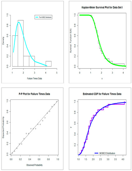 We compared the fits of the MOBE-2 distribution with some competitive models, namely: exponential (E ), odd Lindley exponential (OLiE), MO exponential (MOE ), moment exponential (MomE ), the logarithmic Burr–Hatke exponential (Log BrHE ), generalized MO exponential (GMOE ), beta exponential (BE ), MO–Kumaraswamy exponential (MOKwE ), Kumaraswamy exponential (KwE ), and Kumaraswamy MO exponential (KwMOE ). See the PDFs of the competitive moels in [21,22,23,24,25,26,27,28,29,30,31]. We considered the Cramér-Von Mises (), the Anderson–Darling (), and the Kolmogorov–Smirnov (KS) statistics. The and statistics are given by:
