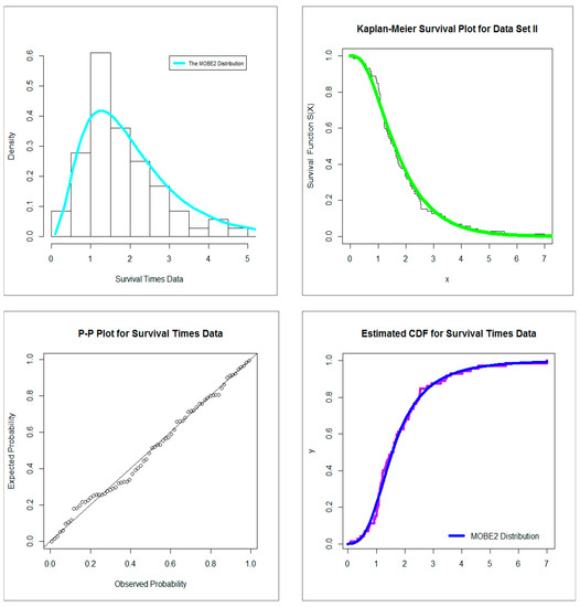 Based on Table 2, Table 3, Table 5 and Table 6, the proposed lifetime MOBE-2 model is much better than many competitive models, such as the E, MomE, MOE, GMOE, KwE, BE, MOKE, and KMOE models, so the new lifetime model may be a good alternative to these models in modeling relief times and survival times data sets. From Figure 5 and Figure 6, we note that the MOBE-2 model gives an adequate fit with the two real data sets.