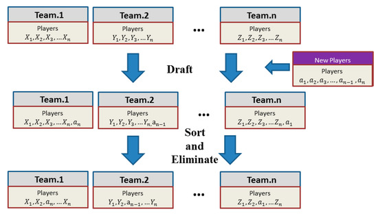 Figure 1 shows the principle of drafting strategy. The strength of teams is ranked from high to low, and set to 1, 2, …, n. The players on the group may be symbolled as X, Y, Z. Among new players, to represent the rank of the strength of players from high to low. After sorting and eliminating, new players are added to the team, and the weakest players are removed. The advantage of the team could be improved by more diversity.