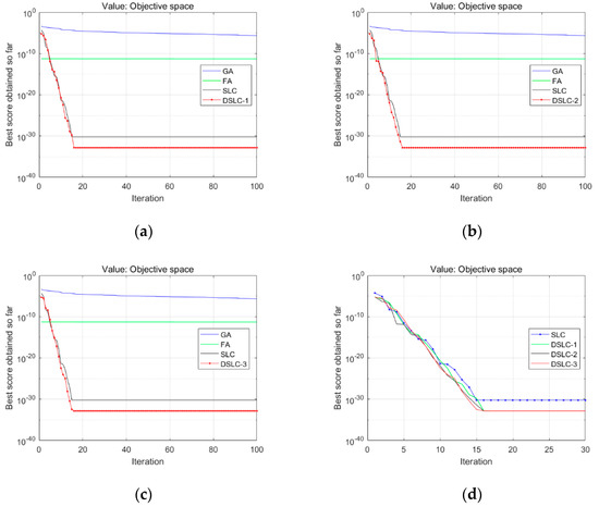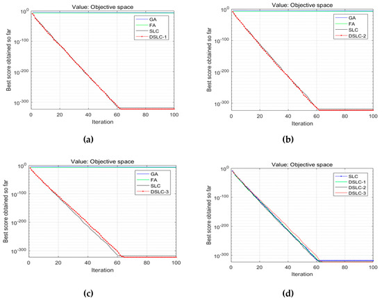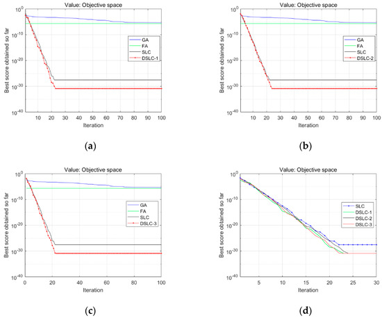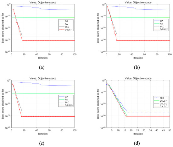 Figure 3, Figure 4, Figure 5 and Figure 6 show the comparison results of the proposed schemes of DSLC-1, 2, and 3 with the SLC, FA, and GA algorithms listed in (a), (b), and (c), respectively. Panel (d) compares three schemes of strategies with the SLC algorithm for testing function 3.