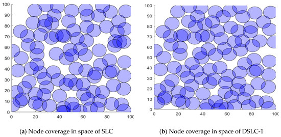Node distributed results of the optimized deploying node position layout visually, by the proposed scheme DSLC-1 and the SLC method, respectively.