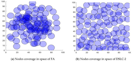 WSN deployment still faces many challenges that are related to determining node positions to ensure a trade-off between different metrics. Due to the high density of WSN, finding an optimal deployment becomes an NP-Hard task. This section presents the applied DSLC algorithm to the deployment optimization of WSN based on node coverage technique. The experimental results of the DSLC algorithm are compared with the SLC, GA [40], and FA [41] algorithms for the coverage of node layout in the deployment of WSN.
