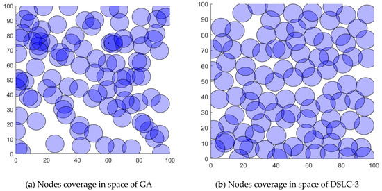 Figure 10 shows the comparison of the obtained coverage rate of the proposed DSLC-3 with the SLC, FA, and GA methods for the deployment WSN optimization. It can be seen from the figure that the proposed scheme of DSLC-3 can cover the entire deploying area with the best layout of the nodes. It can be concluded from the experimental results that the effect of the DSLC achieves the optimal global solution and generally produces better than the SLC, FA, and GA algorithms.